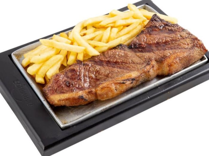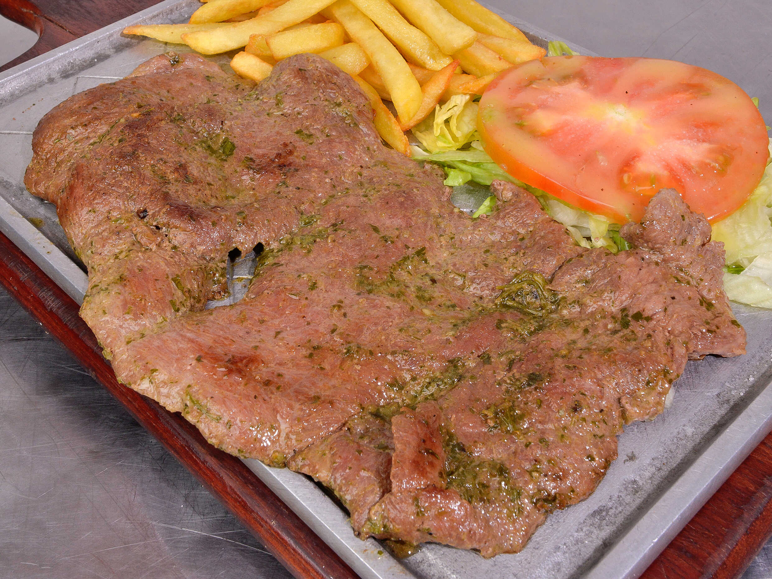 De res o de pollo acompañado de papa a la francesa y ensalada (tomate, lechuga y vinagreta).