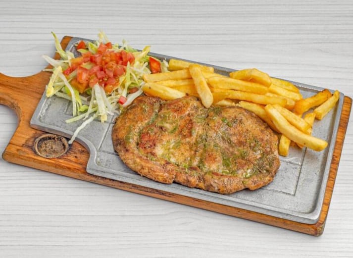 Filete de cerdo, papa a la francesa y ensalada (tomate, lechuga y vinagreta).
