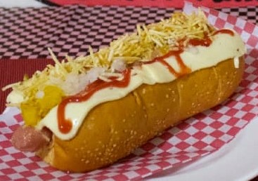 Pan Bimbo, salchicha ranchera, tocineta, queso, cebolla, ripio y salsas.