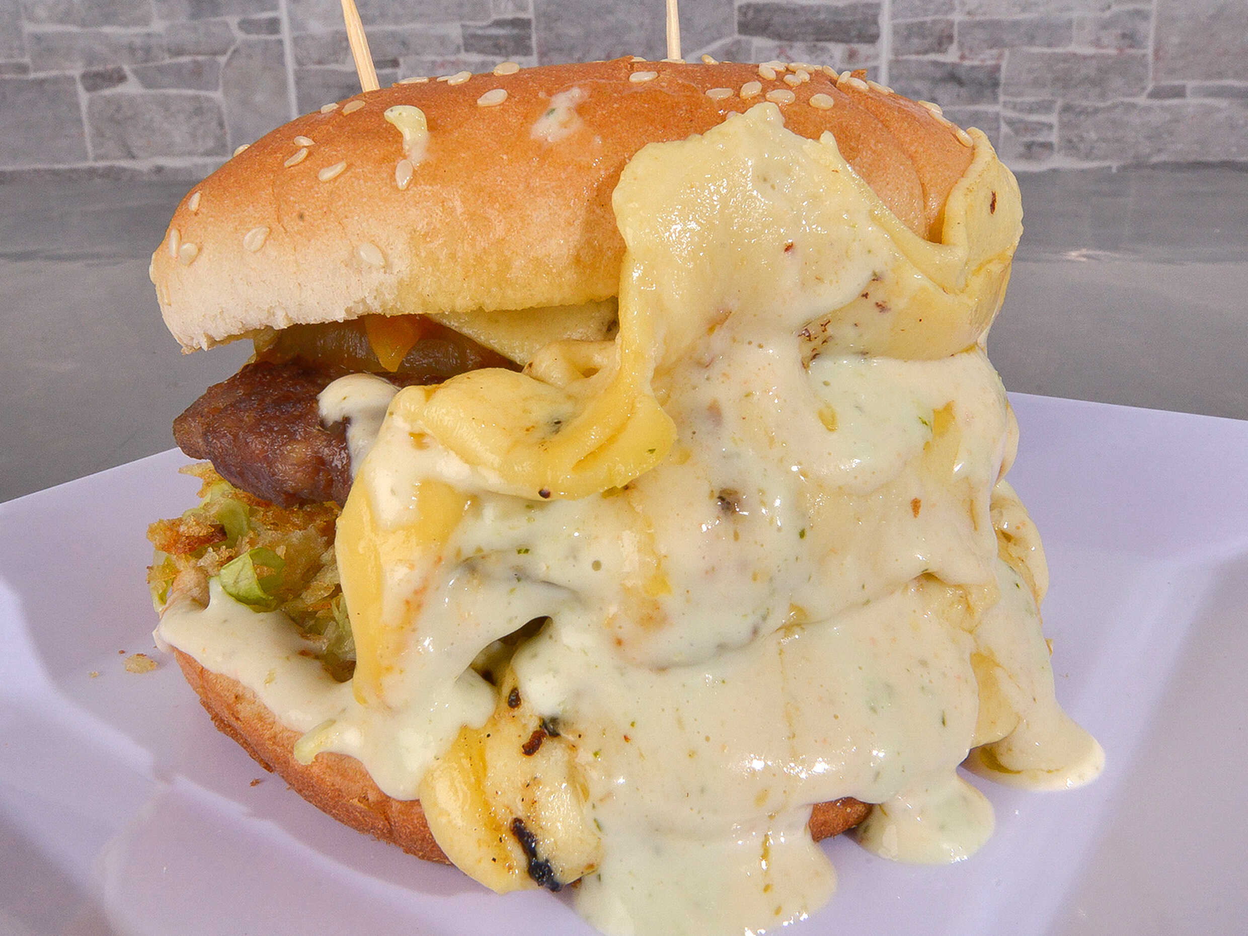 Pan Bimbo, doble filete de pollo, doble queso, doble tocineta, lechuga, tomate, cebolla, ripio y salsas.