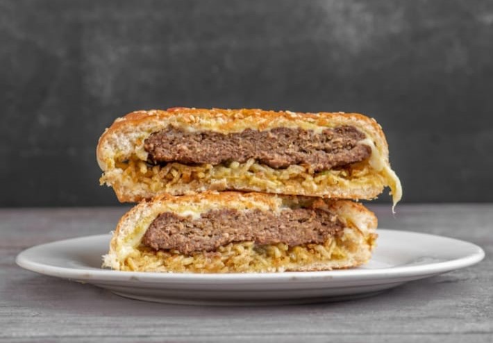 Pan Bimbo, carne, tocineta, queso, ripio y salsas.