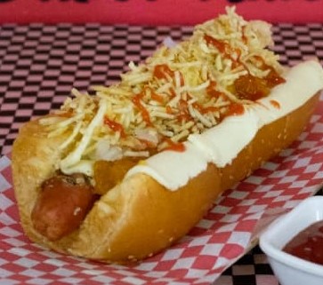 Pan Bimbo, salchicha americana, tocineta, queso, cebolla, ripio y salsas.