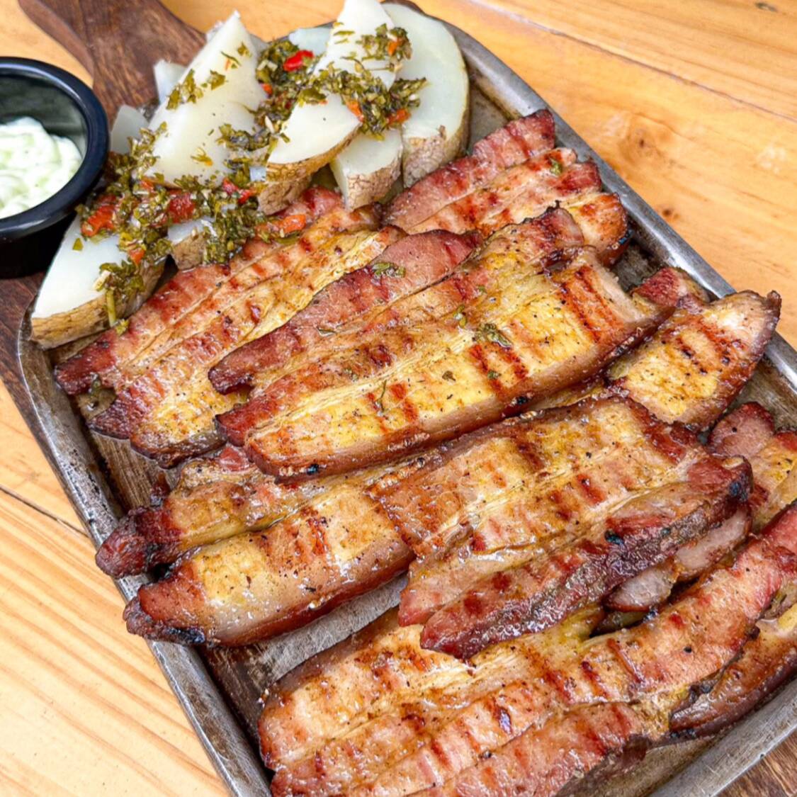 400 Gramos de deliciosa panceta ahumada y horneada, servida en laminas. Acompañada de papa cocida, ensalada y salsas de la casa.