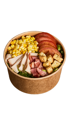 Pechuga de pavo, lechuga Batavia, lechuga romana, miel mostaza, maíz tierno, tomate chonto, croutones y tocineta.
