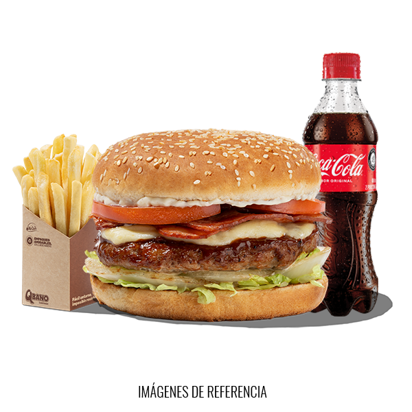 Deliciosa Hamburguesa tradicional de carne de Res y Cerdo, Queso Mozzarella, Tocineta, Tomate, Lechuga, Cebolla, Salsa BBQ con papas medianas y gaseosa 400ml