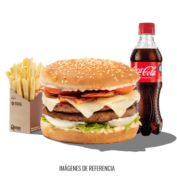 Deliciosa Hamburguesa con doble carne con tocineta, tomate, cebolla, salsa BBQ y queso con papas medianas y gaseosa 400ml