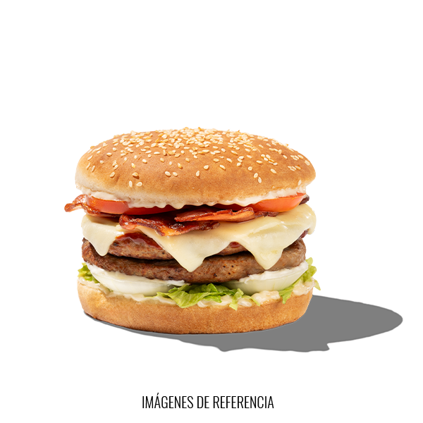 Deliciosa Hamburguesa con doble carne con tocineta, tomate, cebolla, salsa BBQ y queso