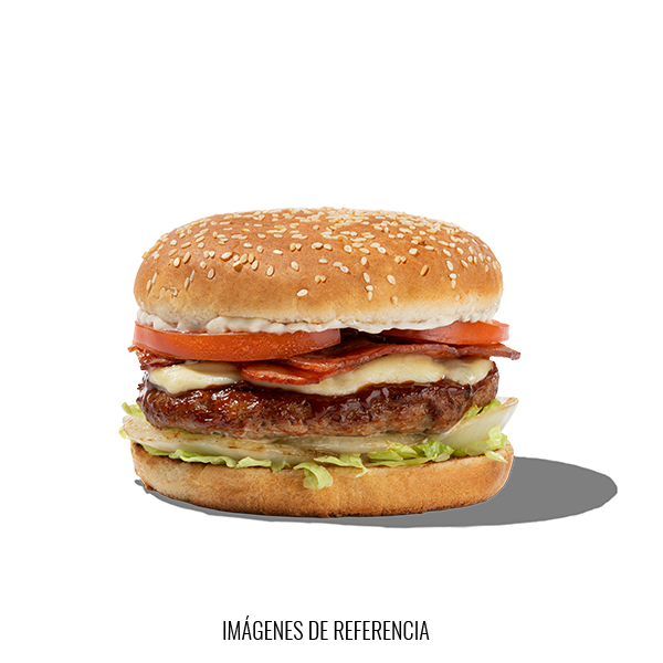 Deliciosa Hamburguesa tradicional de carne de Res y Cerdo, Queso Mozzarella, Tocineta, Tomate, Lechuga, Cebolla, Salsa BBQ.