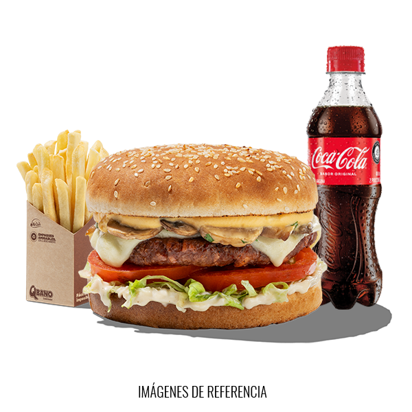 Deliciosa Hamburguesa vegetariana con carne veggie, champiñones frescos, Queso Mozzarella, Salsa de Queso Cheddar con papas medianas y gaseosa 400ml