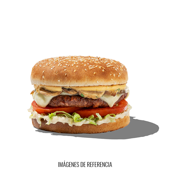 Deliciosa Hamburguesa vegetariana con carne veggie, champiñones frescos, Queso Mozzarella y Salsa de Queso Cheddar.
