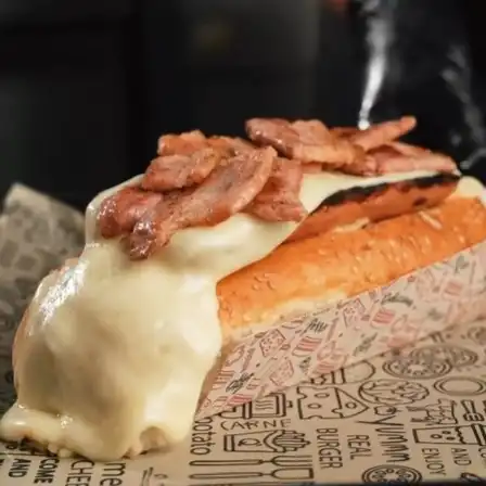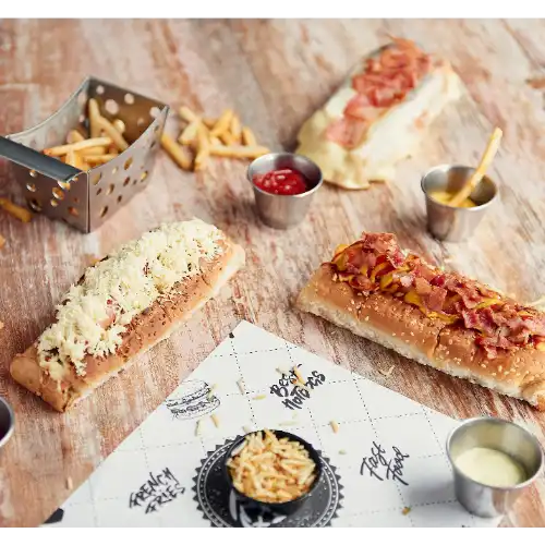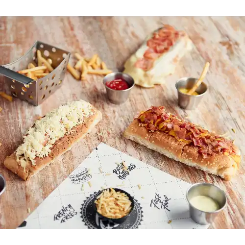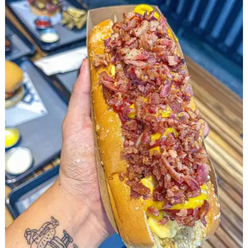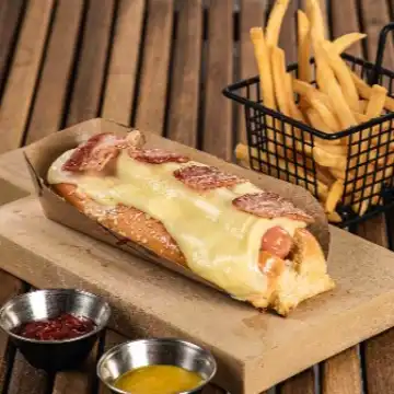 ¿Buscabas un perro con mucho queso? Salchicha americana, doble tocineta ahumada, queso cheddar, papas en fosforito, salsa de tomate y mostaza. ¡Este es!