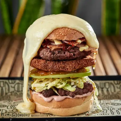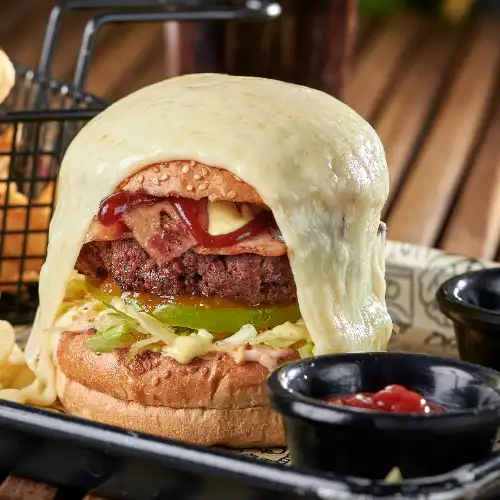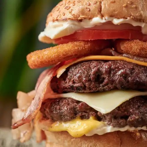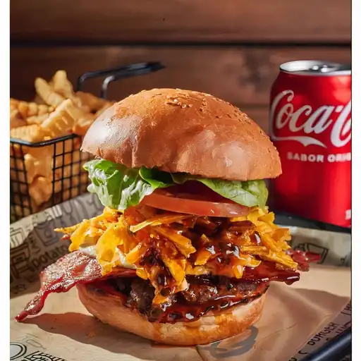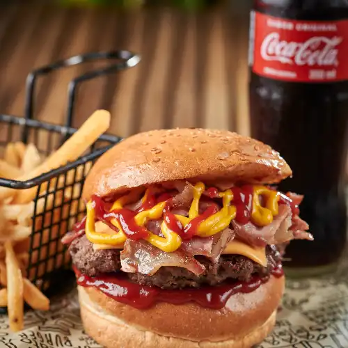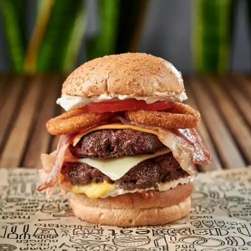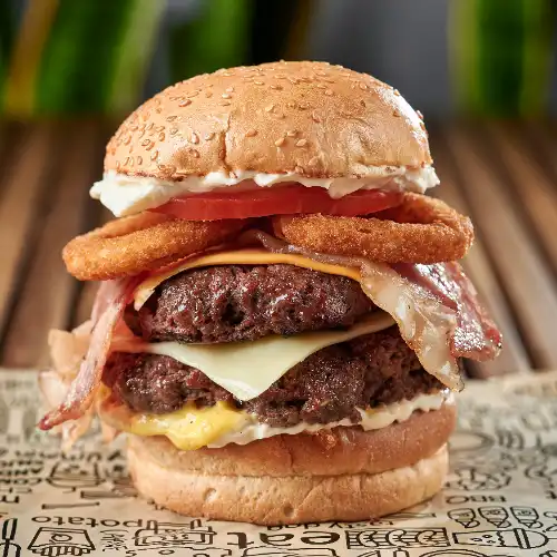 Doble carne de res de la casa 320 g, queso americano, queso doble crema, queso Philadelphia, extra de tocineta, aros de cebolla apanados, tomate rojo, mayonesa y miel mostaza.