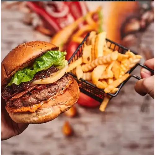 Hamburguesa con doble carne de res de la casa 320 g, pollo apanado o filete, extra de tocineta ahumada, mozzarella, lechuga, tomate verde, salsa rosada, showy y BBQ.