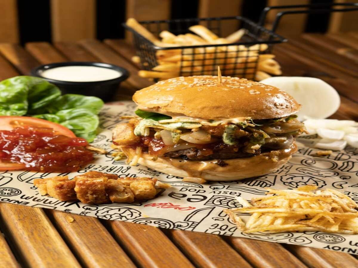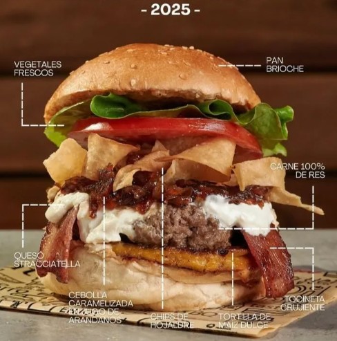 Burgermaster 2022, carne de la casa 160 g, plátano verde rallado, queso campesino, tocineta ahumada, queso Philadelphia, sirope de maracuyá con panela, lechuga, tomate rojo y salsa de la casa.