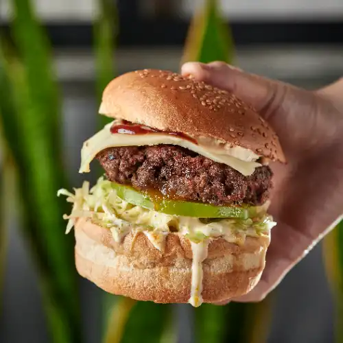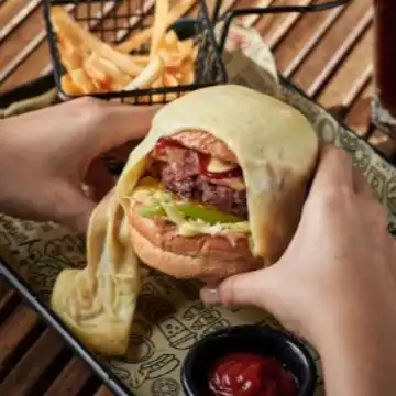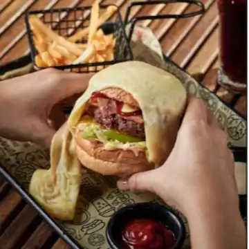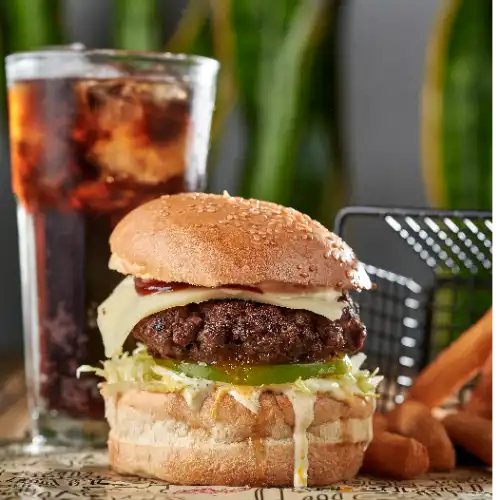 Carne de res de la casa 160 g, queso doble crema, lechuga, tomate verde, salsa de piña, salsa de la casa y BBQ, un acompañante y una bebida a elección.