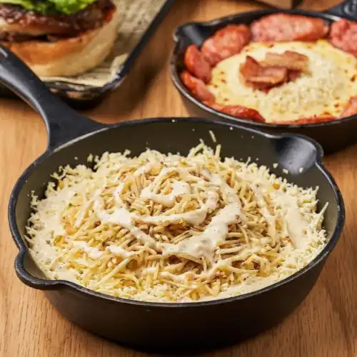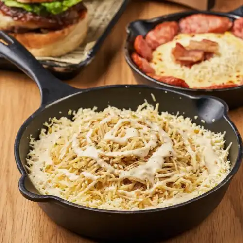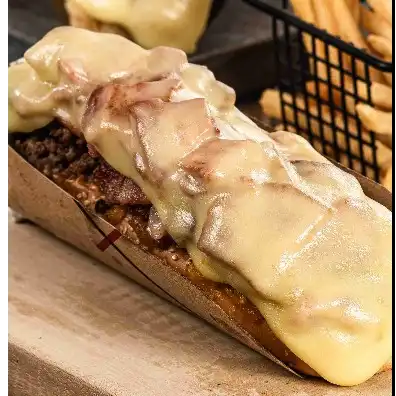 Queso mozzarella gratinado, papas en fosforito, salsa de la casa, salsa de piña, salsa rosada, BBQ y la infaltable extra de tocineta ahumada.