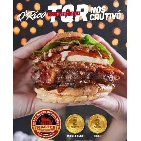 Ganadora del Burger Master 2025. Una combinación que enamora: carne 100% res con receta casera, pan brioche, queso stracciatella, tortilla de maíz dulce, tocineta crujiente, nuestra famosa cebolla caramelizada en jugo de árandanos, chips de hojaldre y la imperdible salsa Q´Rico. Porque lo bueno no se olvida y lo rico dura dura para siempre.