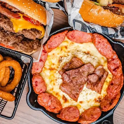 Carne de res de la casa finamente picada o pollo filete en cuadritos, extra de tocineta ahumada, queso mozzarella gratinado, papas en fosforito y salsa de la casa, salsa de piña, salsa rosada y BBQ.