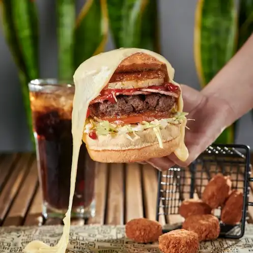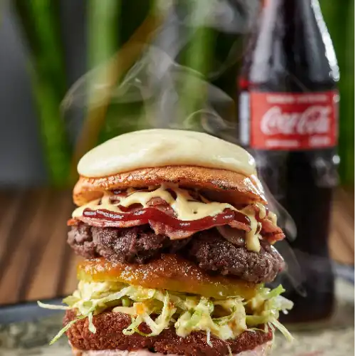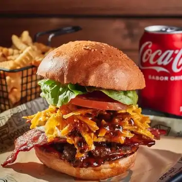 Hamburguesa con carne de res de la casa, tocineta ahumada, queso mozzarella gratinado, tomate verde, lechuga, salsa de piña, rosada, showy y BBQ.