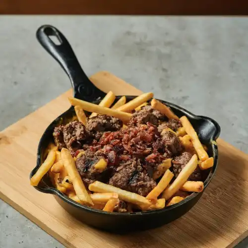 Elige entre nuestras papas a la francesa o criollas, acompañadas de queso cheddar derretido, crujiente tocineta y nuestra jugosa carne de la casa.