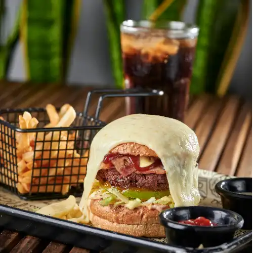 Carne de res de la casa 160 g, pollo apanado o filete 140 g, extra de tocineta ahumada, queso mozzarella gratinado, lechuga, tomate verde y salsas, un acompañante y una bebida a elección.