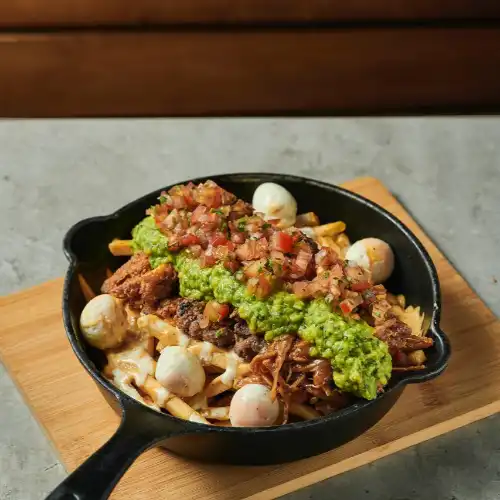 Elige entre nuestras papas a la francesa o criollas y disfruta de una combinación inigualable: jugosa carne de la casa, crujiente pollo apanado, pulled pork, acompañado de pico de gallo, guacamole, huevos de codorniz y nuestras ya famosas salsas.