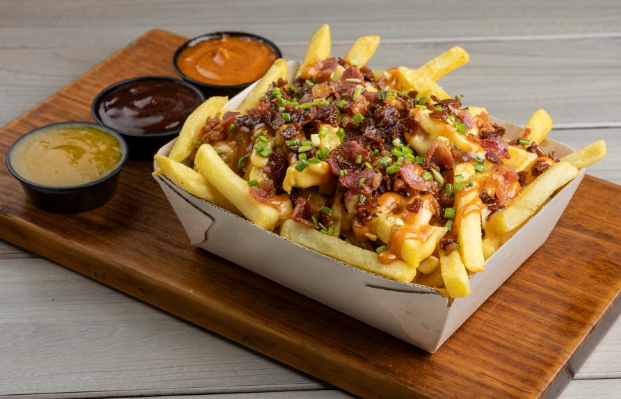 Papas fritas, tocineta crocante, queso cheddar, salsa de la casa, cebollín, miel de maple, acompañados de 2 Coca-Colas de 250 ml.