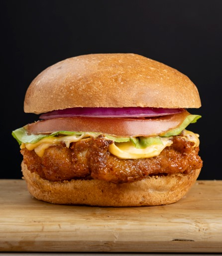 Hamburguesa Chicken Crispy BBQ (Filete de pollo apanado, queso americano, pepinillos, tomate, lechuga, cebolla, salsa de la casa, pan.) + papas + bebida