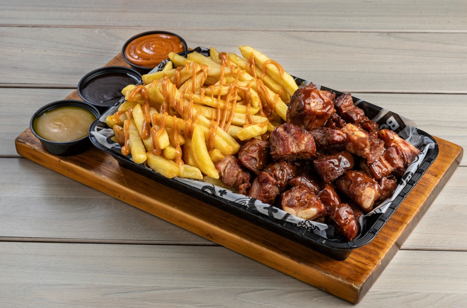 500 g de costillas en salsa BBQ de la casa, papas a la francesa, 2 Coca-Colas de 250 ml.