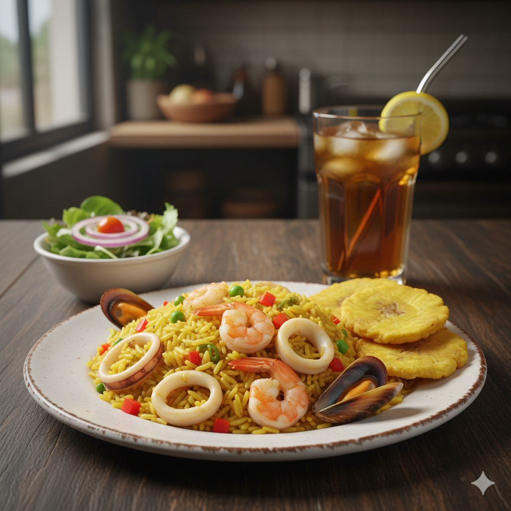 300 g de Arroz con mariscos acompañado con patacón, ensalada y agua de panela con limón.