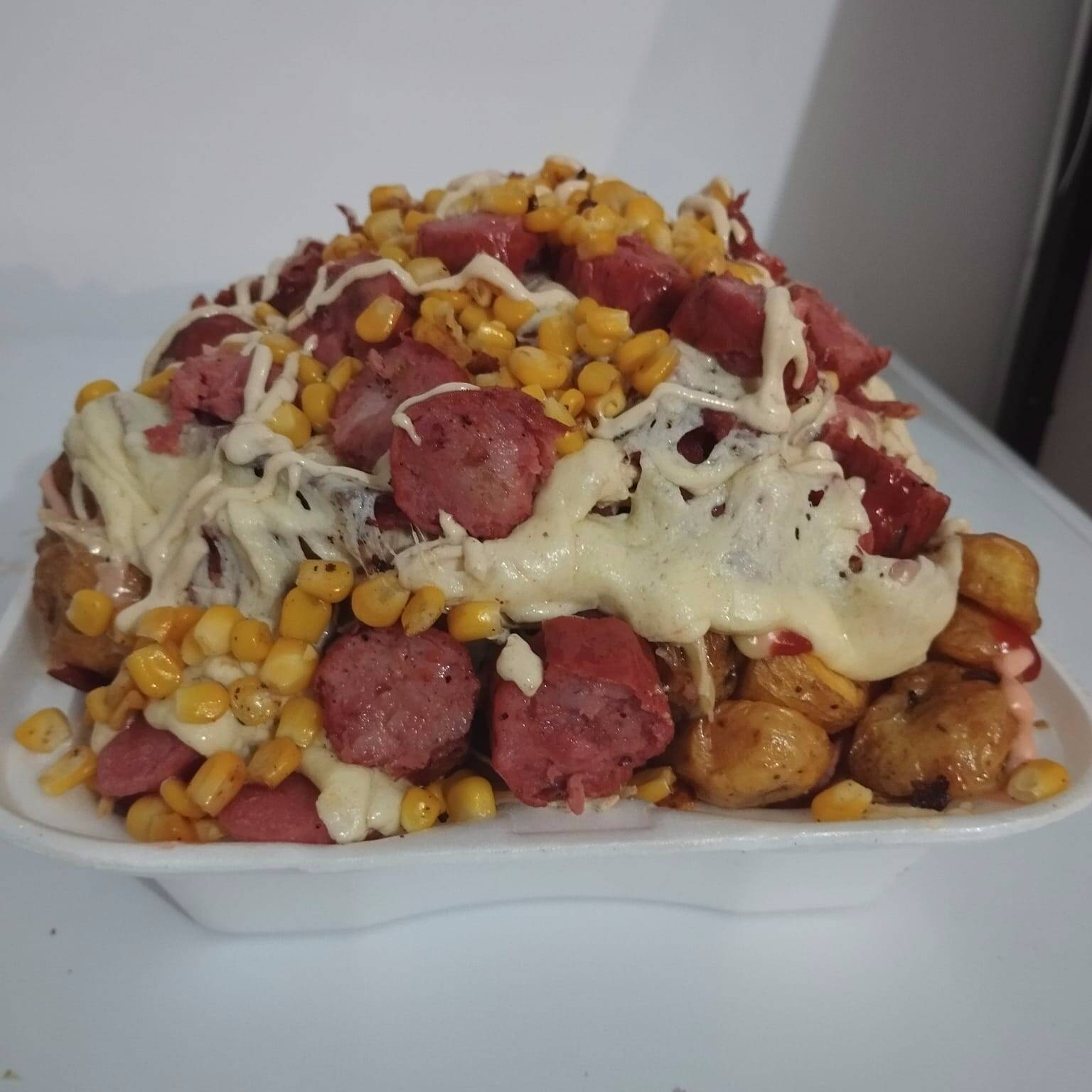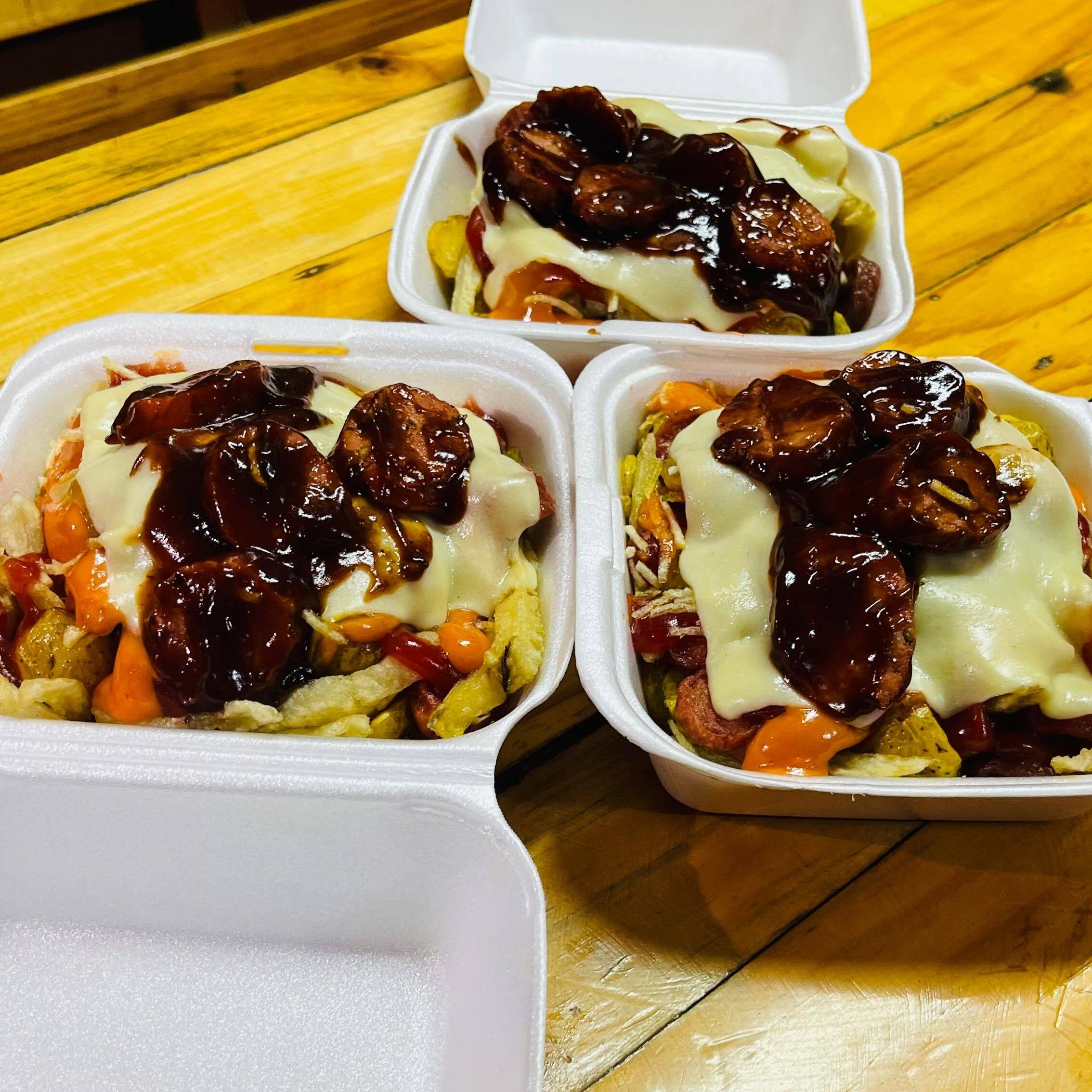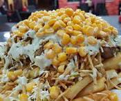 Salchipapa Para 2-3 personas + Papa criolla, Salchicha, Ripio, Carne de hamburguesa, Chorizo, Tocineta, Salsas, Ripio y Queso.