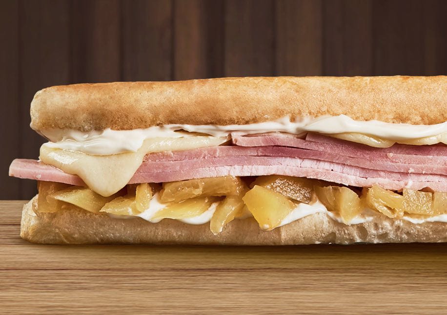 pan, lechuga,jamon,salsas,ripio, piña calada, queso .