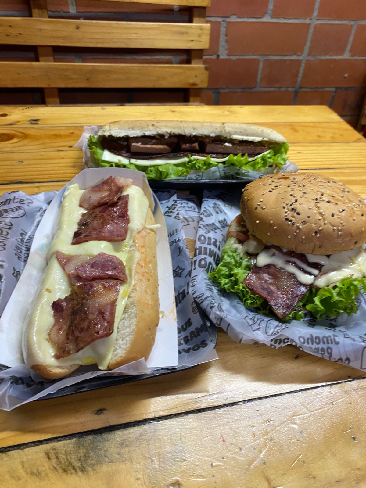 Pan Bimbo, ripio, salsas (tomate, tartara, ajo, piña, rosada), cebolla dulce, batavia, tocineta, jamón, maicitos, queso gratinado y pollo desmechado.