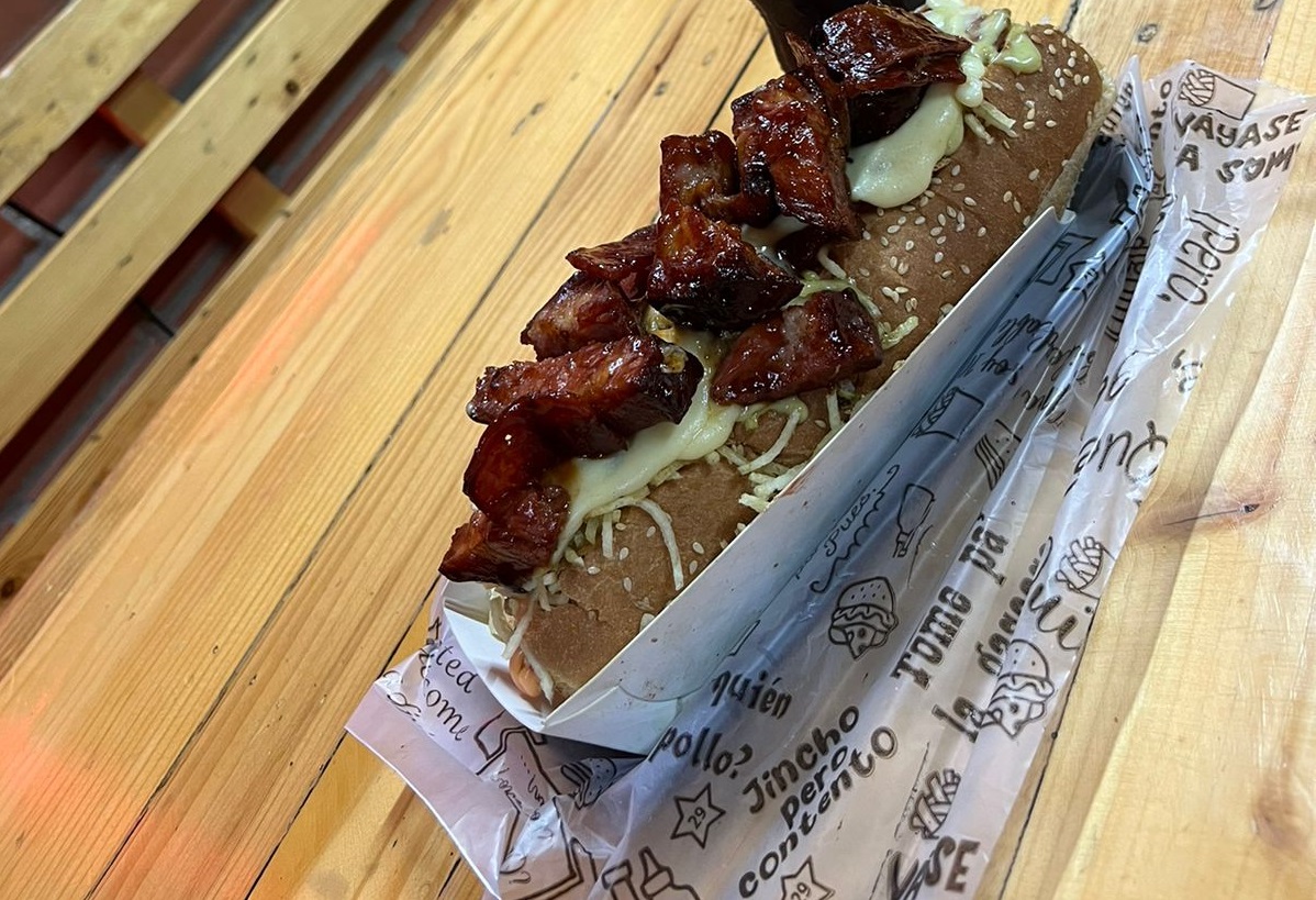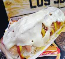 Pan Bimbo, salchicha, ripio de papa, salsas (tomate, BBQ, mostaza, piña, mayonesa), cebolla dulce y queso.
