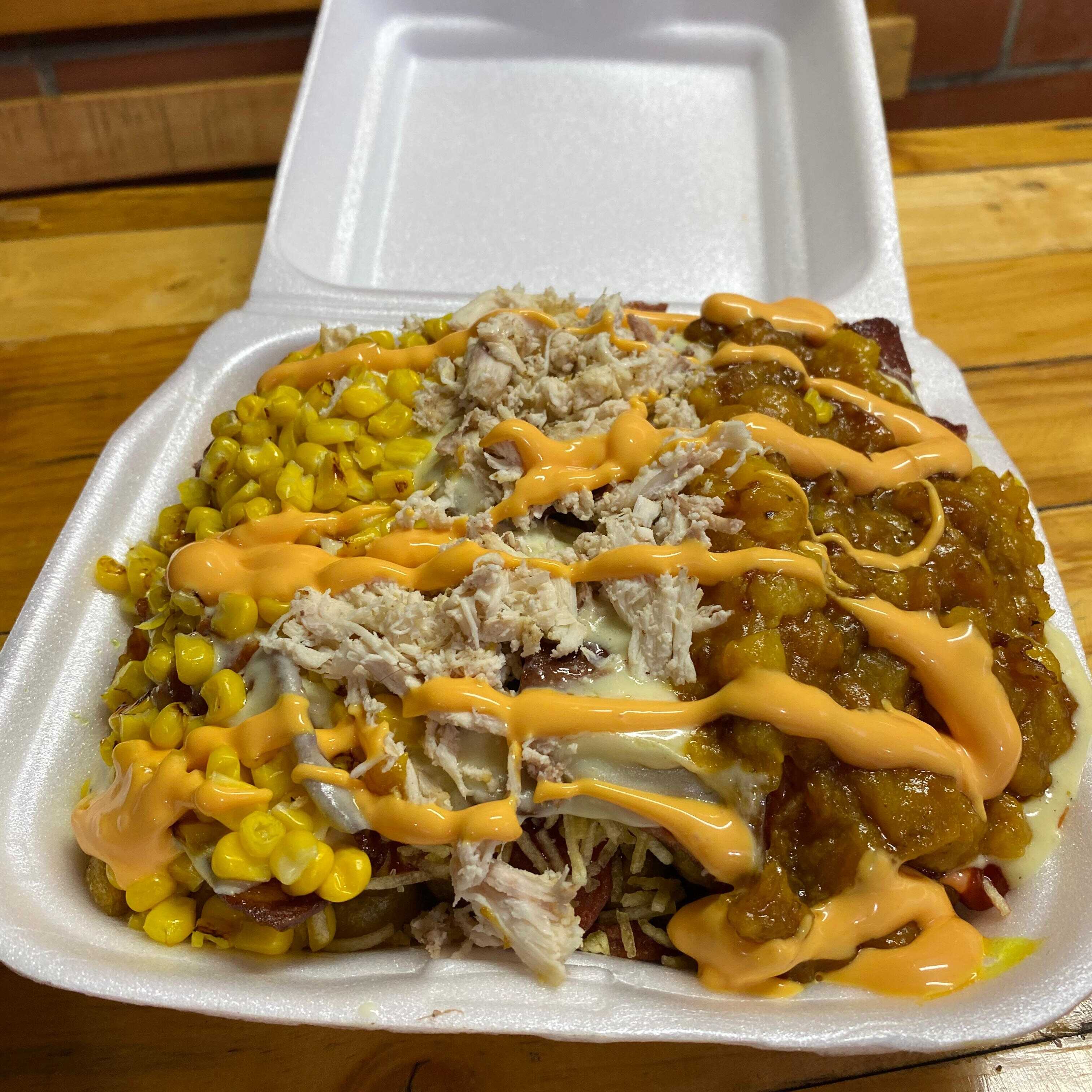 Papa, salchicha, queso cheddar, queso gratinado, tocineta, maicitos, maduro, ripio y salsas.