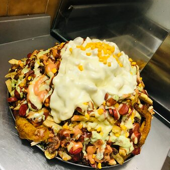 Crujientes papas francesas y criollas, 4 alas de pollo apanadas, jugosas y bañadas en su propio sabor, tocineta crocante, queso cheddar fundido que abraza cada bocado, huevo de codorniz que se derrite suavemente, ripio crujiente y maíz tierno. Todo coronado con tus salsas favoritas, creando un festival de sabores que explotan en la boca 🌟🔥 Un plato lleno de texturas, jugos y delicias.