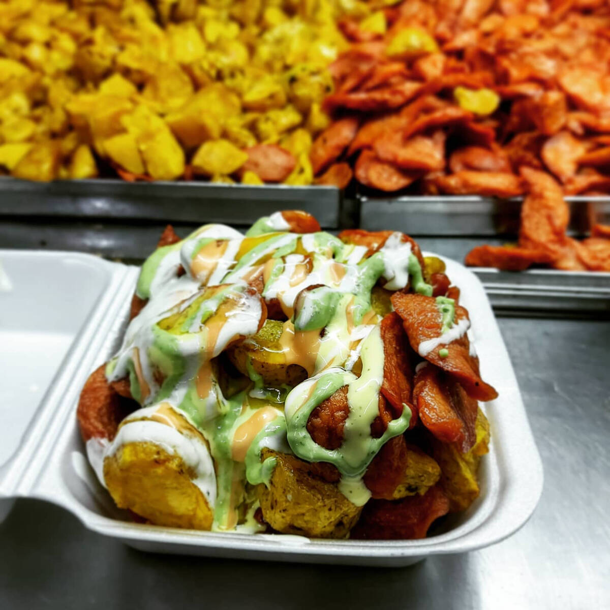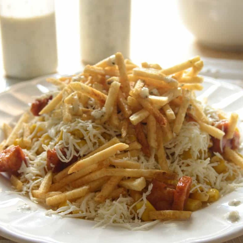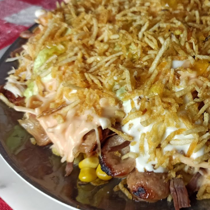 papas francesas o criollas doradas y crujientes, salchicha en rodajas y una deliciosa combinación de salsas. A esta base irresistible le sumamos pollo y carne sazonada a la casa, tocineta crocante, jamón, maíz dulce a la plancha, ripio y cebolla caramelizada, todo cubierto con abundante queso gratinado que eleva el sabor a otro nivel 🧀🔥 Un plato abundante, lleno de textura y sabor.