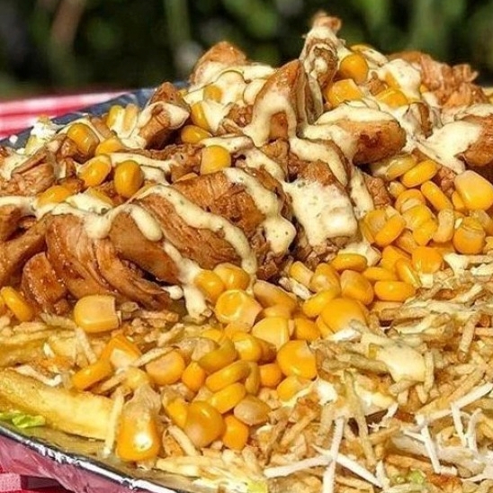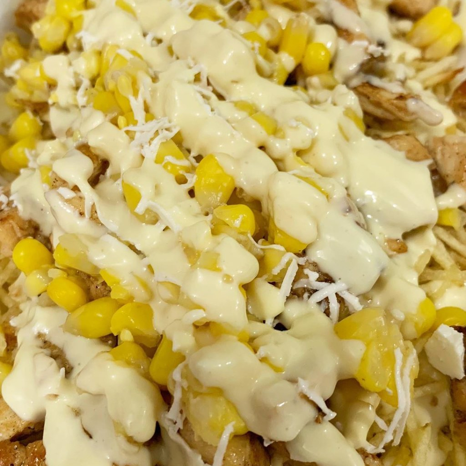 Crujientes papas a la francesa, abundantes ripio crujiente y mazorcadas dulces 🌽🍟 Acompañadas de pollo jugoso y champiñones salteados, con queso fundido y tocineta crocante, y coronadas con salsas al gusto 🌟🔥 Un plato lleno de texturas, donde las papas, el ripio y las mazorcadas son los protagonistas y los demás ingredientes complementan la experiencia 🤤