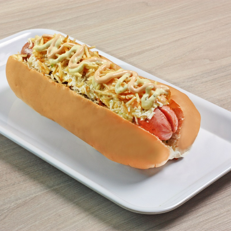pan artesanal, salchicha americana, queso crema, ripio y salsas al gusto.