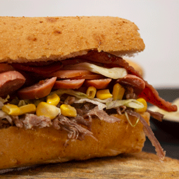 Pan artesanal suave y dorado, con pechuga jugosa o carne a tu elección, acompañada de tocineta crocante, vegetales frescos, jamón sabroso y queso derretido. Se complementa con maíz tierno, ripio crujiente y salsas al gusto, creando un bocado lleno de sabor y texturas irresistibles 🤤🔥