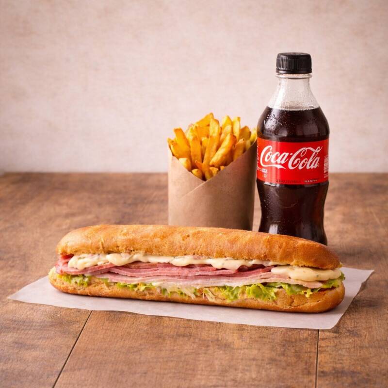 Maximega Jamón y queso recién preparado, acompañado de 1 papas doradas y Coca-Cola 250 ml. La combinación perfecta para quedar bien servido sin gastar de más.