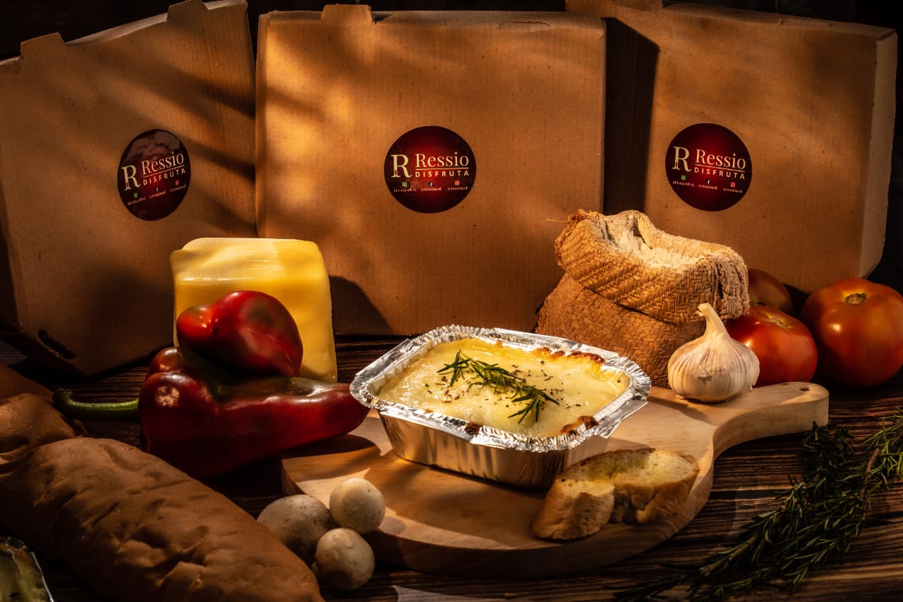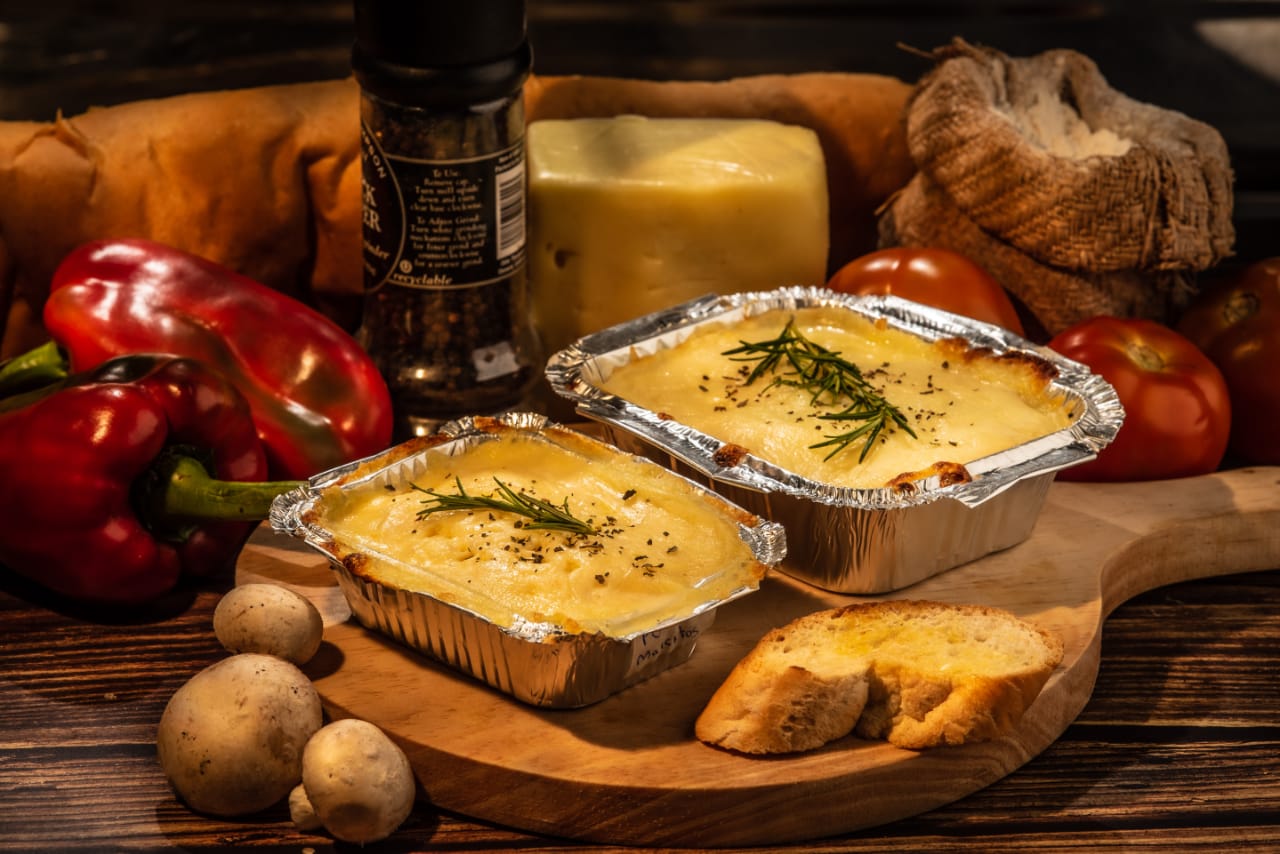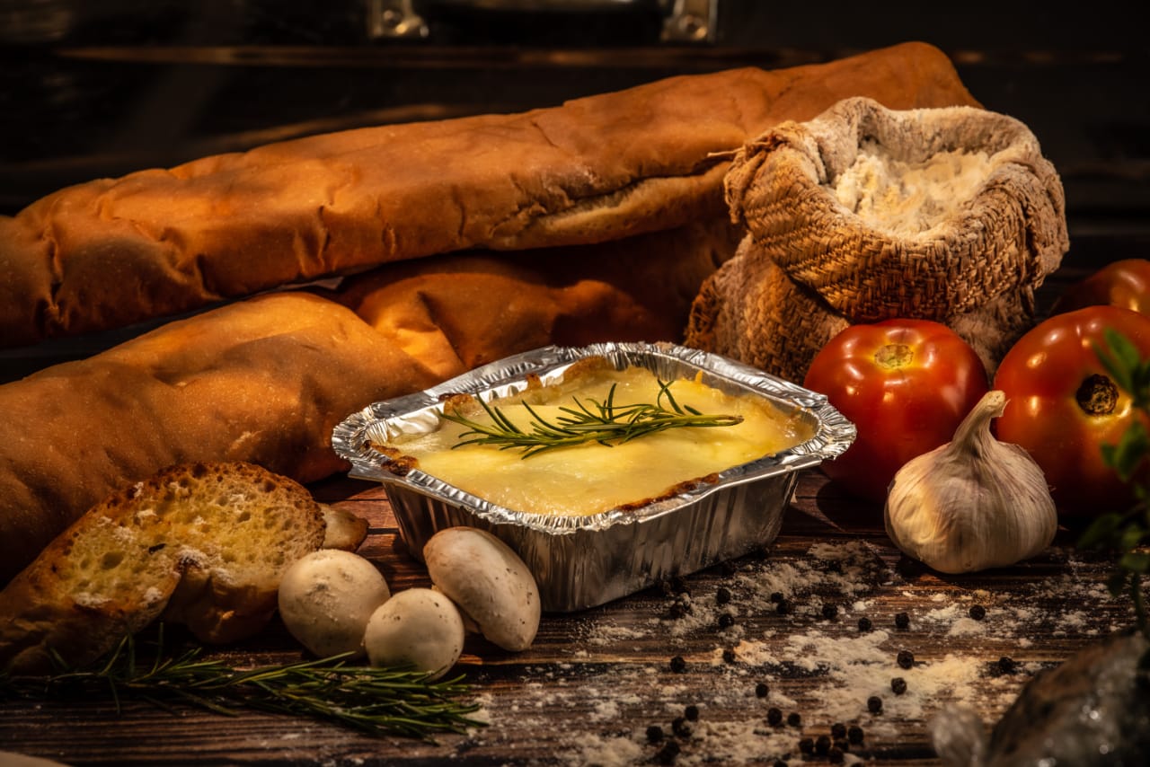 Lasaña de pollo combinada de maicitos y tocineta, tiene queso mozarella.