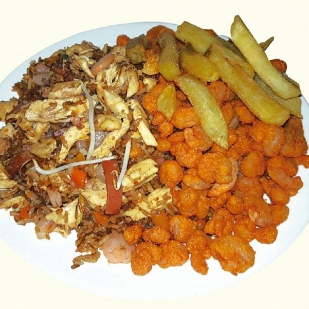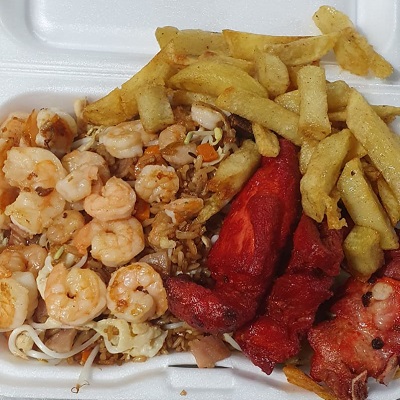 Delicioso arroz chino con camarones acompañado de porción de costilla ahumada y papas a la francesa.