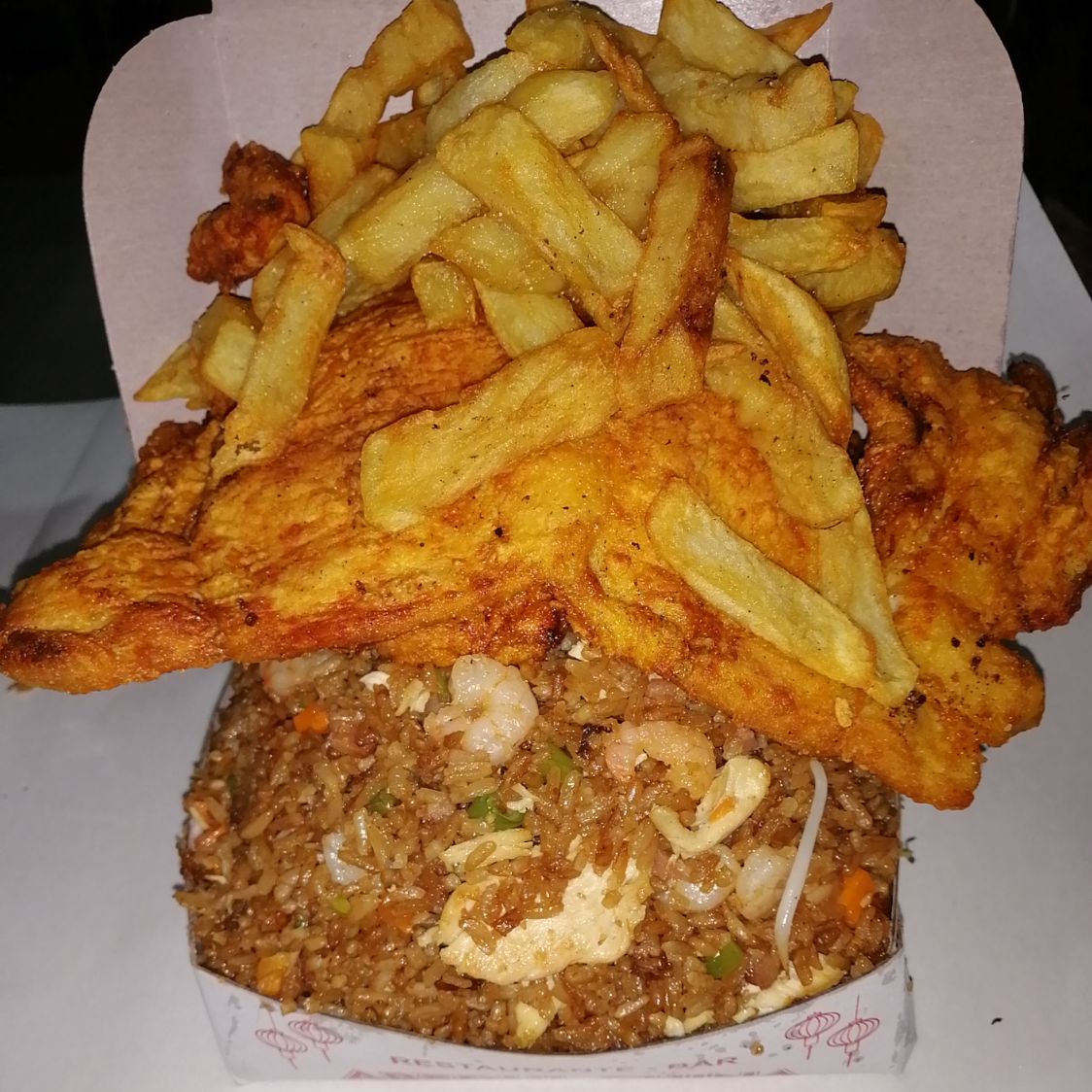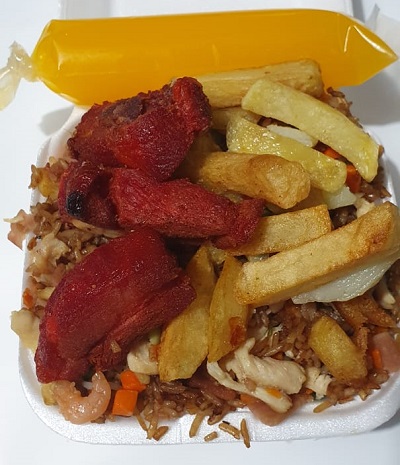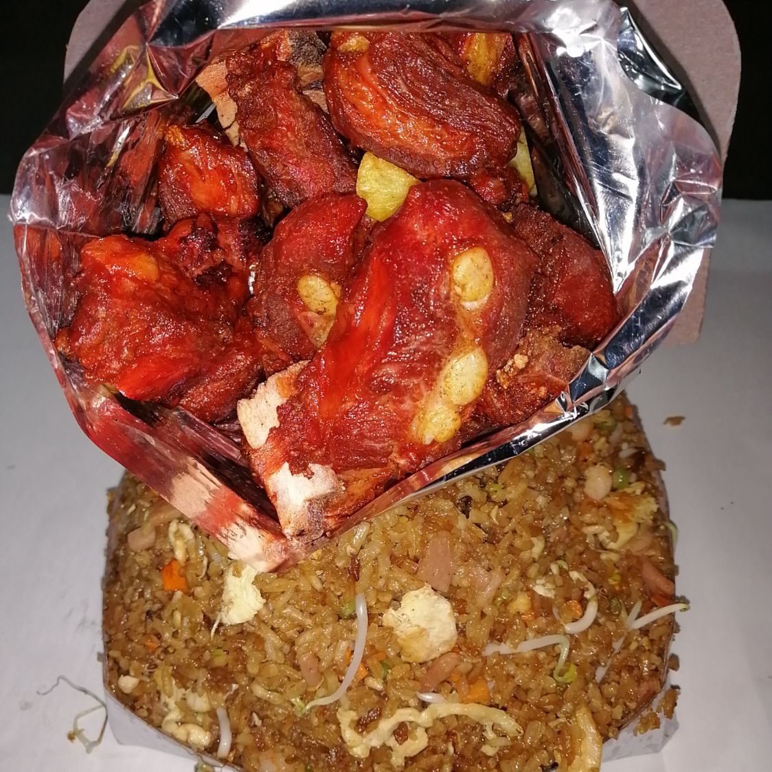 Delicioso arroz chino acompañado de trozos de pollo, cerdo y camarón acompañado de porción de costilla de cerdo y papas a la francesa.