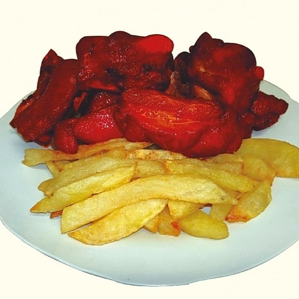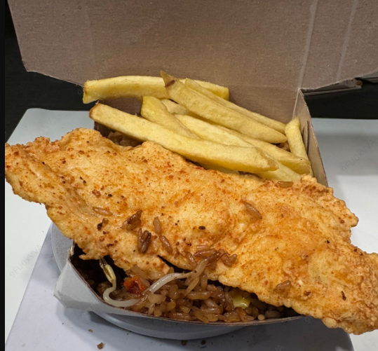 Delicioso arroz chino acompañado de papas a la francesa con chuleta de pollo (2 personas).