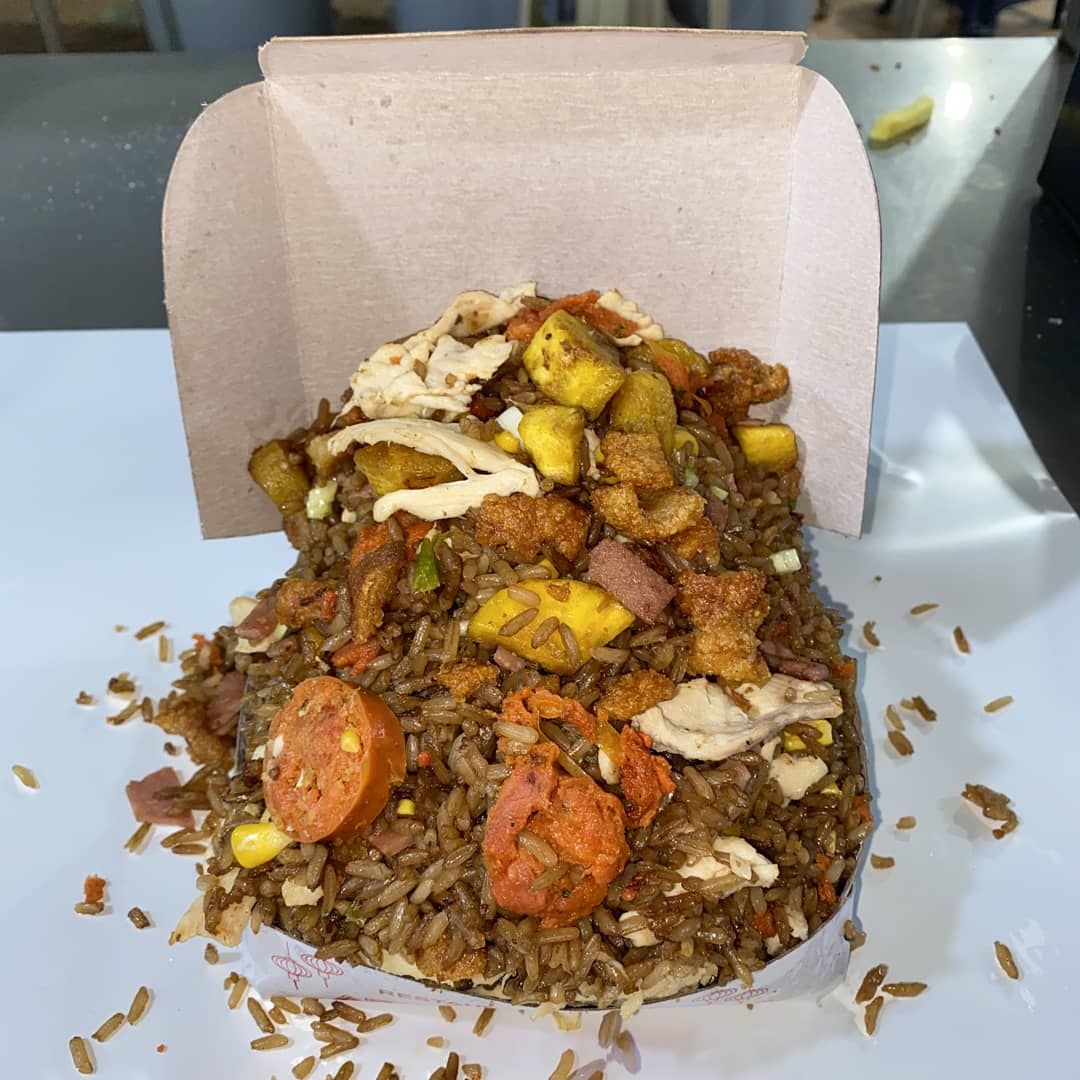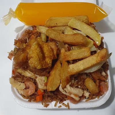 Delicioso arroz chino acompañado de trozos de pollo, cerdo y camarón acompañado de una presa de arroz frito y papas a la francesa.