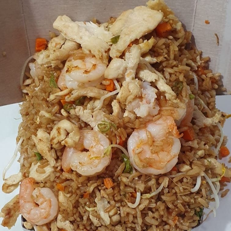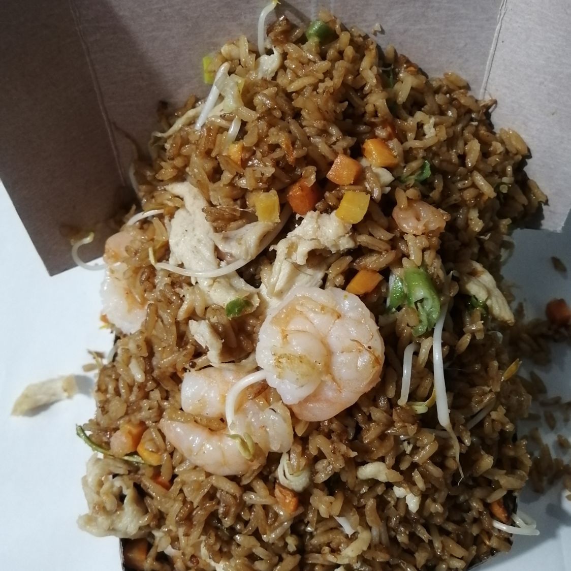 Delicioso arroz chino acompañado de trozo de pollo, cerdo y camarón (2 personas).
