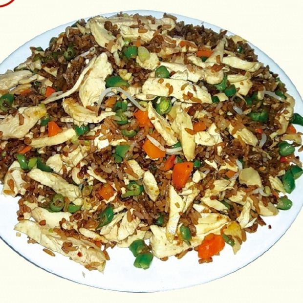 Delicioso arroz chino con pollo de arroz y verduras (2 personas).