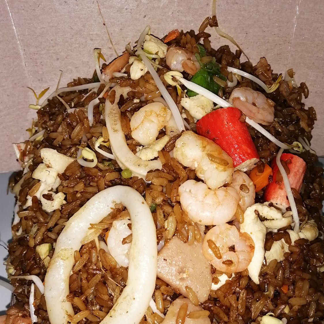 Delicioso arroz chino acompañado de camarones, trozos de pollo, brócoli, zanahoria, apio (4 personas).