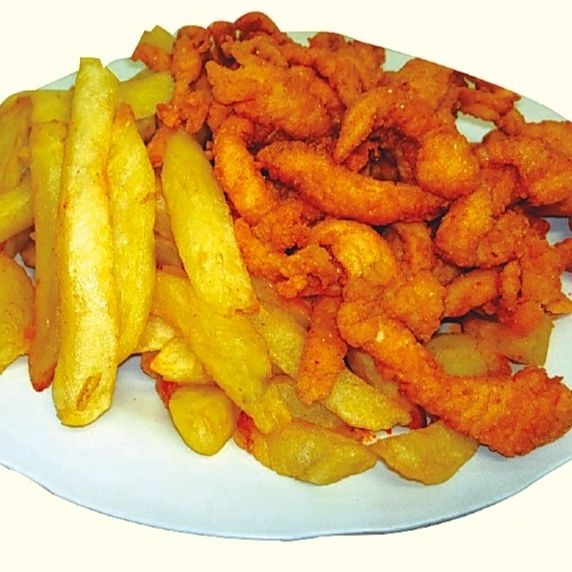 Delicioso trozos de pollo apanado con papas a la francesa.